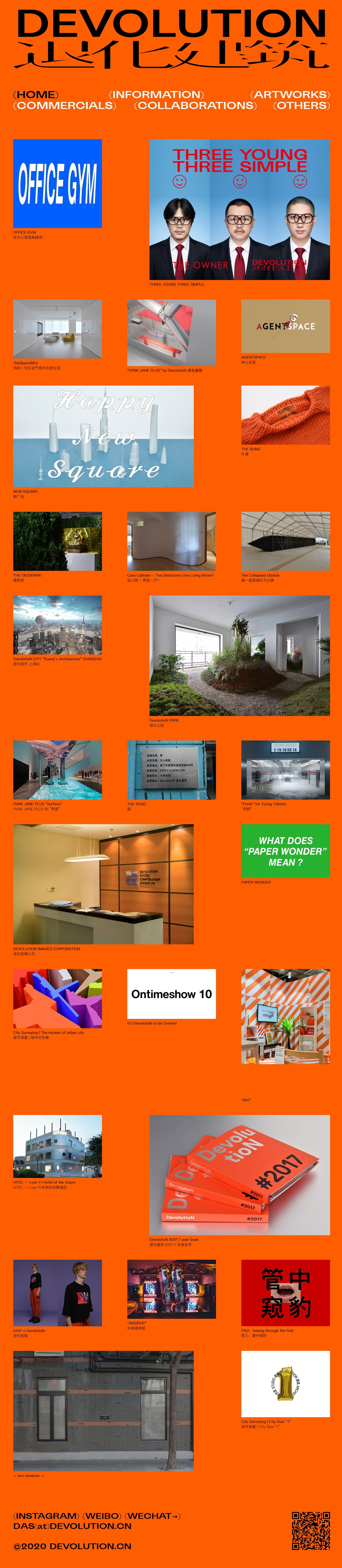 "DEVOLUTION", established in 2016 by Tang Jiansong, Wang Qi and Yang Lutong, is a "3A company" dedicated to providing comprehensive plans of Architecture, Art and advertisement. "DEVOLUTION" is also an open and creative studio that inspires to connect architecture with various media, produces new ideas on architecture and urban living, and hopes to bring architectural thinking and artistic approaches into different areas.